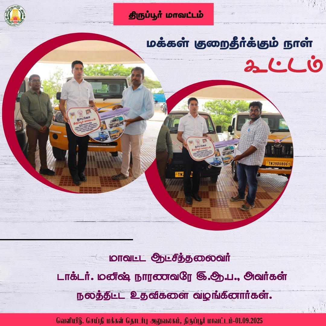 A Public Grievance Redressal Day meeting was held in Tiruppur district on 01.09.2025. District Collector Dr. Manish Narnaware I.A.S. distributed welfare assistance.